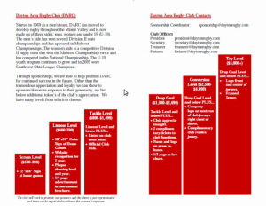 | Dear Community Business Leader, The Dayton Area Rugby Club is a not for profit organization established in 1974 to promote and advance the game of Rugby Union Football in the Dayton Ohio Metro Area. To this end we solicit sponsorship money in exchange for advertising for our sponsors. The Dayton Area Rugby Club plays games throughout the Midwest as well as many places in the East and South, because of this your logo on our jerseys will get recognition in many places besides Dayton and Southwest Ohio. We want to thank you for your consideration in this matter, and we want to assure you that you will find your association with the Dayton Area Rugby Club to be both positive and rewarding for your company or organization. Sincerely, Chip Gleason President, Dayton Area Rugby Club