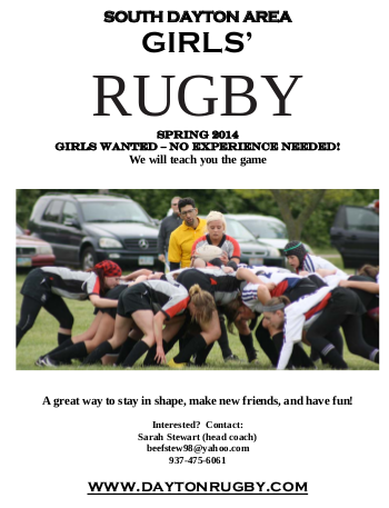 We have established a Dayton Under-19 High School and Under-15 Youth Touch-Rugby League. Our goal is to prepare four teams (boys and girls) from area schools to compete for the Dayton Rugby title. WE HIGHLY ENCOURAGE PARENTAL PARTICIPATION AT TRAINING, GAMES, CLUB EVENTS AND CLUB MEETINGS and ask for your assistance in spreading the word that Rugby is here to stay as an alternative, enjoyable, physical sport. We post timely information on the web site home page.
