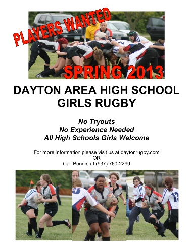 We have established a Dayton Under-19 High School and Under-15 Youth Touch-Rugby League. Our goal is to prepare four teams (boys and girls) from area schools to compete for the Dayton Rugby title. WE HIGHLY ENCOURAGE PARENTAL PARTICIPATION AT TRAINING, GAMES, CLUB EVENTS AND CLUB MEETINGS and ask for your assistance in spreading the word that Rugby is here to stay as an alternative, enjoyable, physical sport. We post timely information on the web site home page.